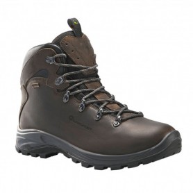 Tomaia realizzata in vera pelle grassata marrone monoscocca, chiusura con anelli e ganci in ottone bronzato, collarino in morbida pelle per massimizzare la comodità. Interno in membrana impermeabile e traspirante con certificazione a calzetta. Suola Vibram modello Mountain Wave in poliuretano nero con disegno antiscivolo, intersuola in nylon semirigido. Vedi sezione Descrizione.